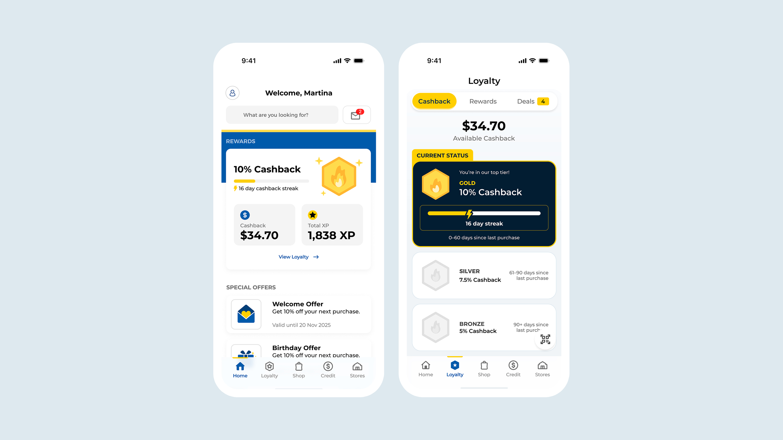What began as a straightforward loyalty app quickly grew in scope. As new requirements emerged around complex cashback mechanics and credit engagement, the design had to balance motivating customers to shop more frequently while making financial features feel approachable rather than intimidating.