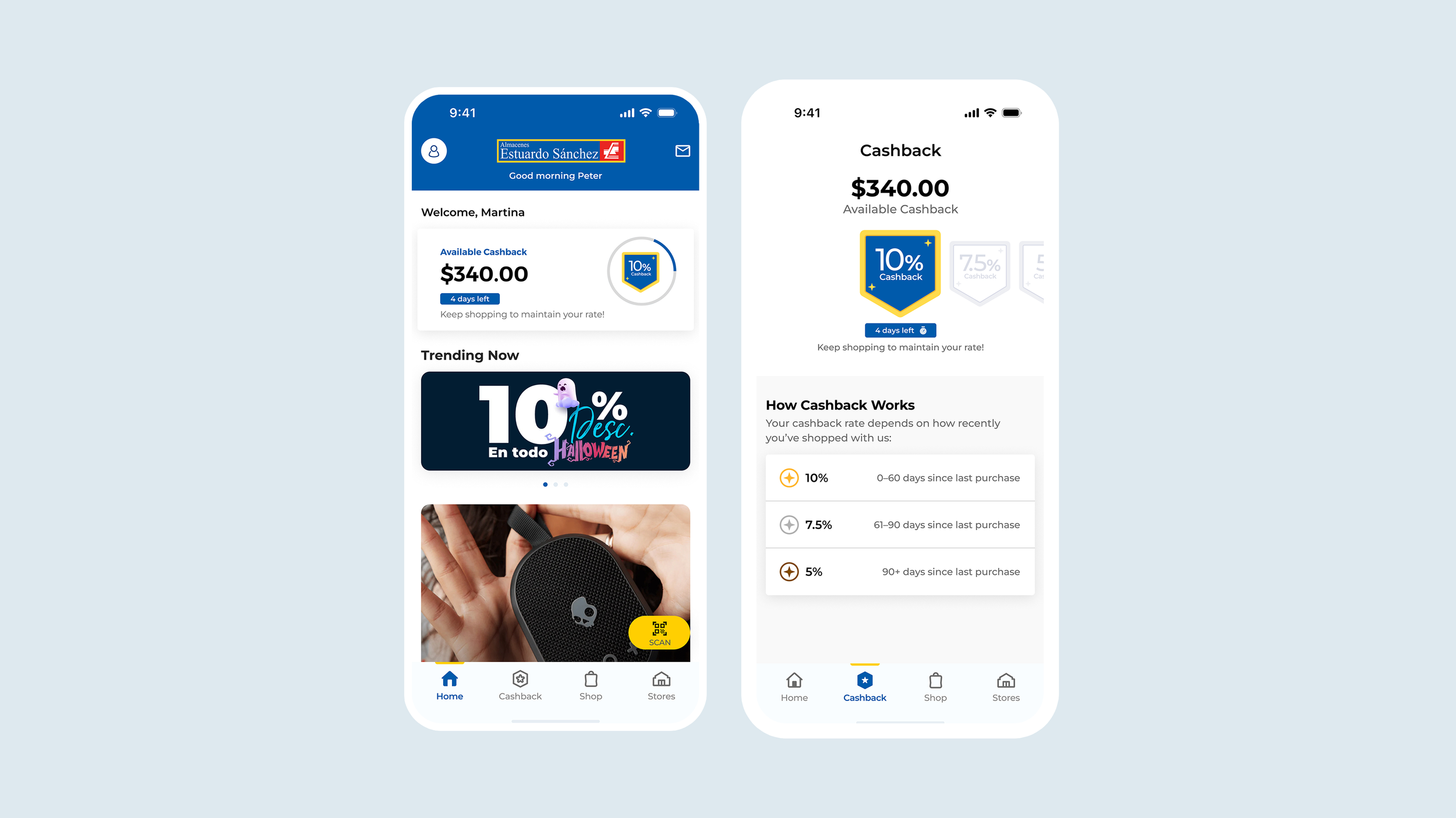 The cashback program's rules were simple in concept but required careful thought to communicate without creating anxiety. Users earn different cashback rates based on how recently they made a purchase: